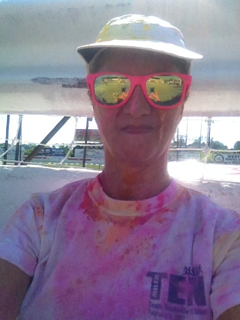 The next color station was purple. I love purple. Half my wardrobe is purple. Surely, purple would be good – much better than yellow. So I took my time passing through the purple color station, my eyes squinted almost shut to keep the purple powder out. But the purple color station was manned by a couple of young girls who may have been working off summer school through volunteerism and picked this volunteer gig over picking up trash along a highway – they weren’t really into it. Now my formerly white ensemble featured a whole lot of yellow and a few little streaks of purple.